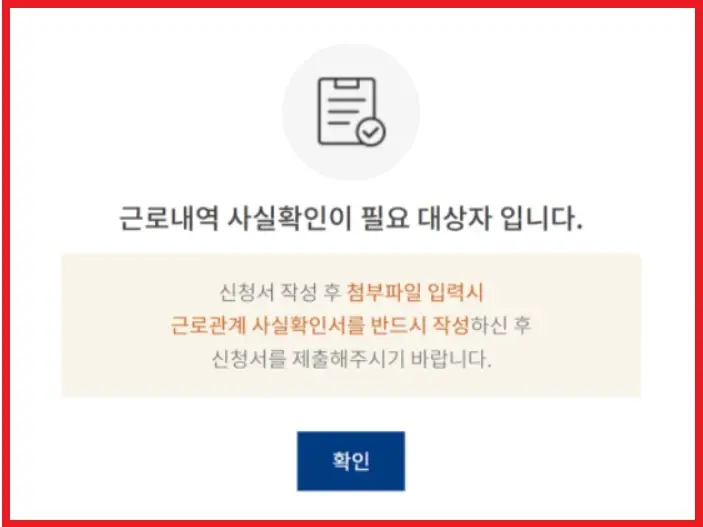 파일을 첨부하고, 신청서 제출을 누르면 완료가 되지만 간혹 위와 같이, '근로내역 사실확인 필요 대상자입니다'라는 메시지가 뜬다면 근로관계 사실확인서를 별도로 등록하셔야 합니다