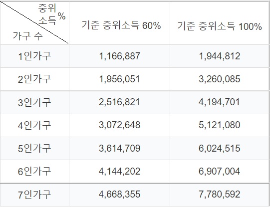 위 자료는 가구당 2022년 기준 중위소득 60%와 100%를 나타낸 표입니다. 여러분들이 보기 편하도록 직접 만들어 보았습니다. 표를 참고하시면서 지금까지 알 수 있었던 정보를 토대로 아래 예시를 보면 이해하기 쉽습니다.