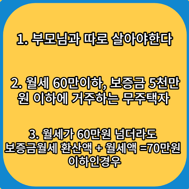 위 자료를 보면 '무주택 청년 월세 지원 조건'이 기본이며, 부모님과 함께 거주하면 안됩니다. 특히, 월세가 60만원 이하 or 보증금이 5,000만원 이하인 무주택자여야 합니다. 만약 월세가 60만원을 초과하는 경우라면, 보증금월세 환산액 + 월세액= 70만원 이하일 때 신청할 수 있습니다.