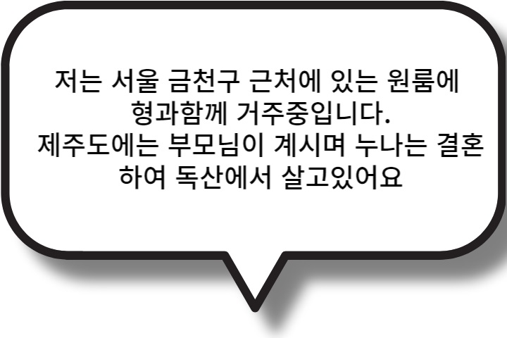 위 예시는 형과 함께 서울에 살고 있고, 제주도에는 부모님이 계시고, 누나는 결혼해서 독산에 거주하는 상황입니다. 이 때 '청년가구'에는 본인과 형 2명이므로, 기준중위소득 60% 2인가구에 해당하는 월 소득 1,956,051원 이하면 됩니다.