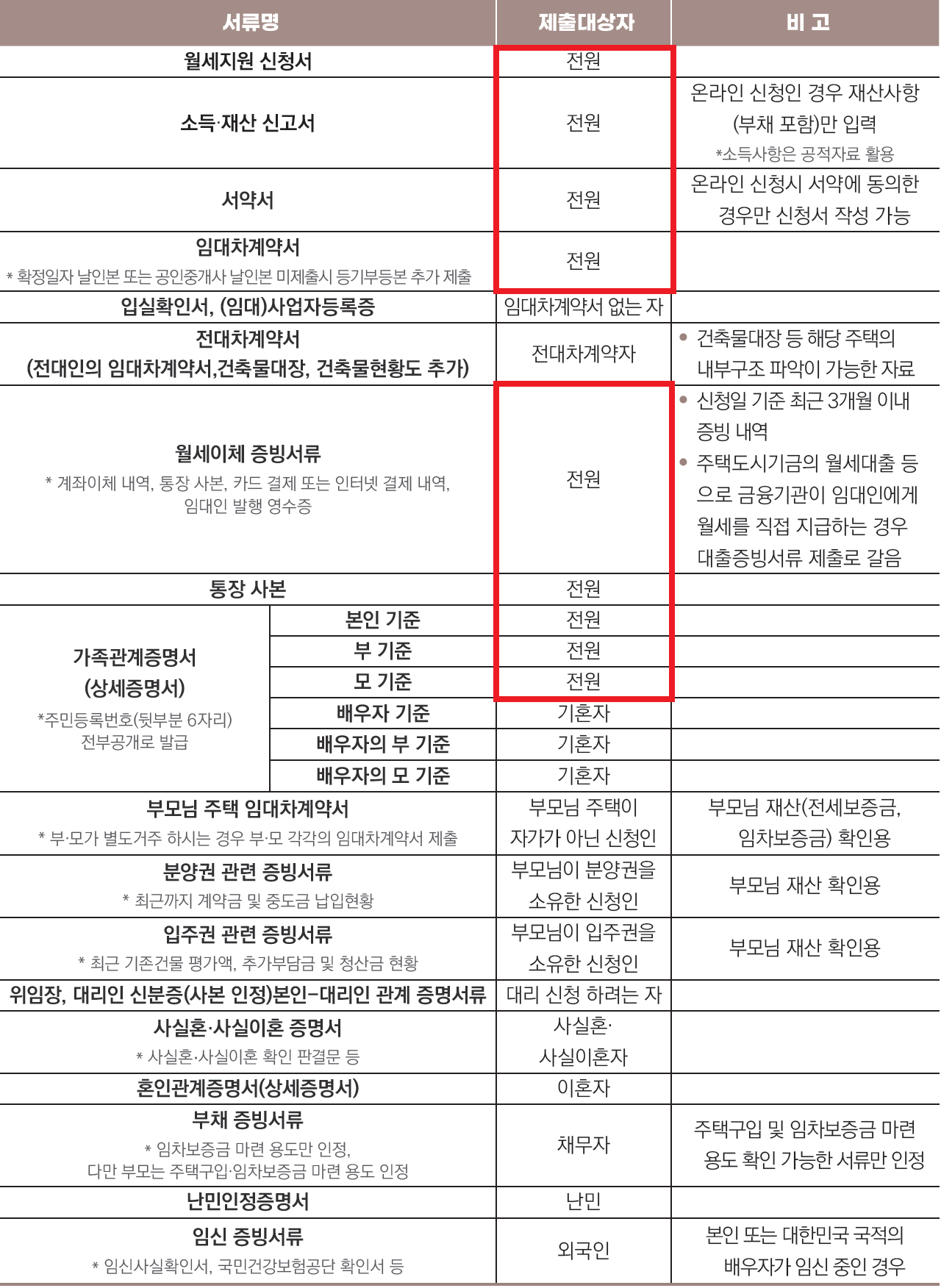참고로 온라인으로 신청하는 경우, 맨 위 항목 3가지 제출서류인 월세지원 신청서, 소득재산 신고서, 서약서는 제출된 것으로 간주되므로 따로 준비하지 않으셔도 됩니다.