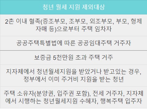 위 자료는 2022 청년 월세지원금을 아예 받을 수 없는 사람을 나타낸 표입니다. 이 외 월세가 연체됬거나, 주민등록이 말소되었거나, 청년 월세 지원을 더이상 받지 않겠다고 거부한 경우, 거주지가 명확하지 않는 경우, 사망한 경우에는 지원금이 중지됩니다.