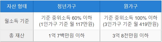 '청년가구'는 2022년 기준 중위소득 60% 이하(월 117만원=1인가구 기준)에 해당되면서 총 재산이 1억 7백만원 이하여야 하고, '원가구'는 2022년 기준 중위소득 100% 이하(월 419만원=3인가구 기준)에 해당되면서 총 재산이 3억 8000만원 이하여야 '청년 월세 지원 조건'에 해당됩니다.
