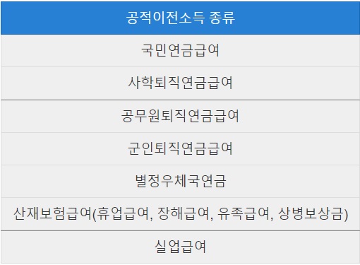 2022 청년 월세지원금을 받기 위해서는 소득으로 합산되는 항목들을 알 필요가 있습니다. 가구원의 '근로소득'을 비롯해, 이자소득, 사업소득 및 재산소득, '공적이전소득'이 있습니다. 공적이전소득 종류는 아래표를 참고하세요.